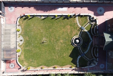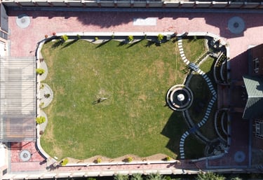 A beautifully designed private residential property, landscaped by Aaab Kashmir. The layout features elegant pathways, green spaces, and a central water element that enhances balance and symmetry.