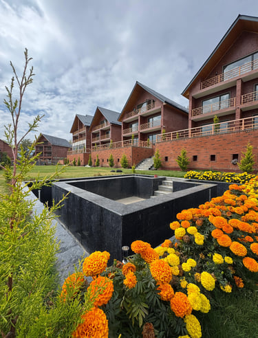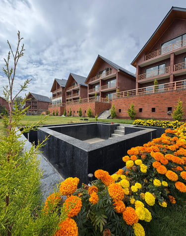 Landscaping and design by Aaab Kashmir at a premium hotel in Pahalgam — where lush greenery and vibrant blooms complement the serene mountain architecture.