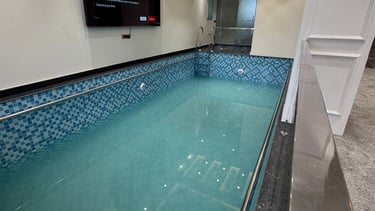 A contemporary indoor residential pool in Budgam, featuring warm ambient lighting and an integrated entertainment screen for the ultimate leisure experience