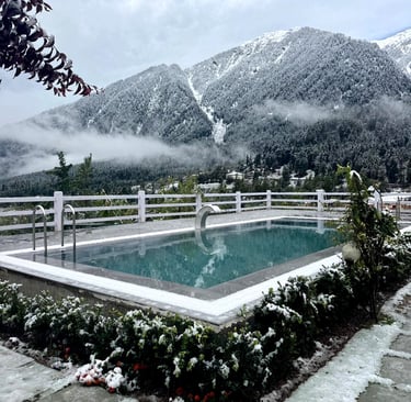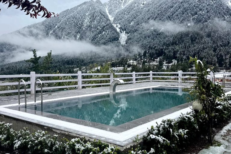 A stunning heated pool designed by AAAB Kashmir at Hotel MountView, Pahalgam — blending luxury with the serene beauty of snow-clad mountains.